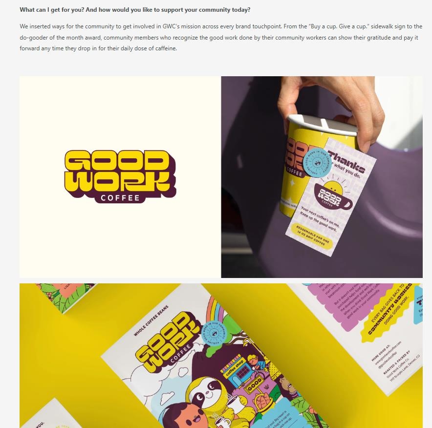 總而言之,Good Work Coffee不僅為社區(qū)工作者提供了高品質(zhì)的咖啡,更通過自己的品牌理念和行動,呼吁每一個人關(guān)注社區(qū)建設(shè),支持那些為我們社會默默奉獻(xiàn)的勞動者。在這條旅程上,GWC和Imaginaria Creative通過設(shè)計和品牌戰(zhàn)略,引領(lǐng)了一種全新的消費(fèi)觀念——讓每一杯咖啡成為改變的力量,讓每一個購買決定都能為社區(qū)帶來積極影響。